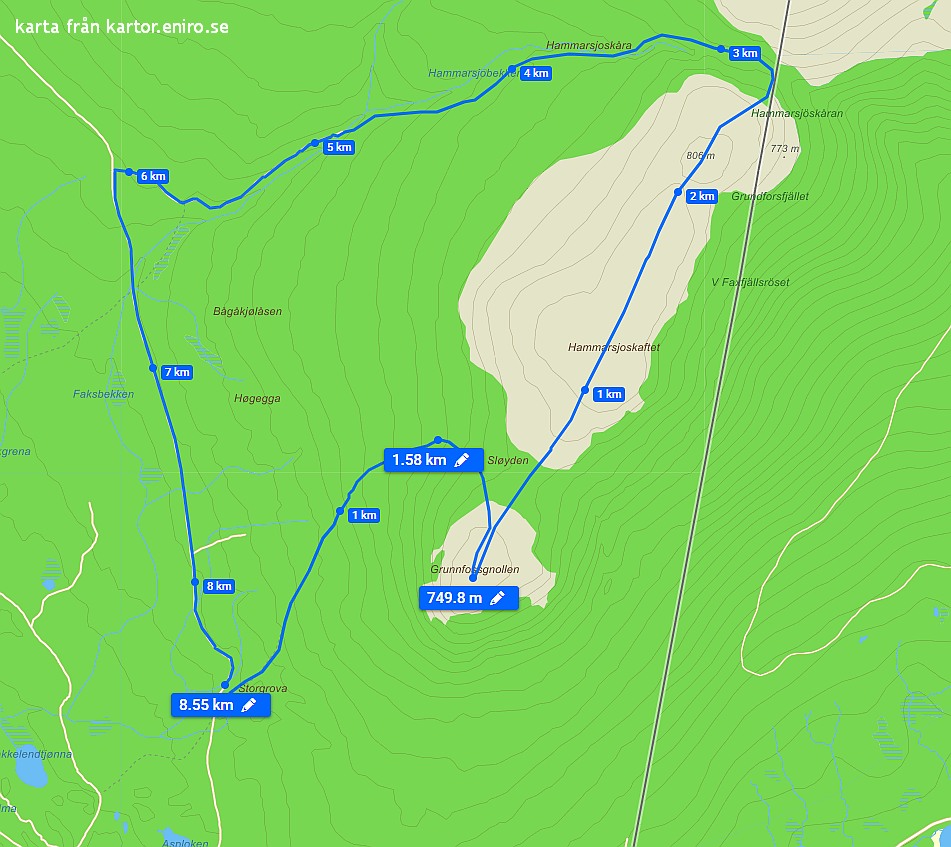 Plötligt ser vi vändplanen nedanför oss mellan träden och man får klura lite hur man ska ta sig ner. En timmerväg går dock i sydlig riktning och vi kommer ut på ett kalhygge ovanför. Efter att ha letat lite går det att ta sig ner på timmervägen och följa den de sista 100 metrarna ner till Faksbekken som vadas lätt. Faksbekken och Hammarsjobekken går ihop ungefär 200 meter uppströms och det är även där som vi hittade en blå markering på en sten längs stigen. Stigen viker dock av norrut mot Skarvdøra och försvinner. Det går inte att gå längs bäcken. Det är sumpigt, stenblock, fallna träd och inte en tillstymmelse till stig.
