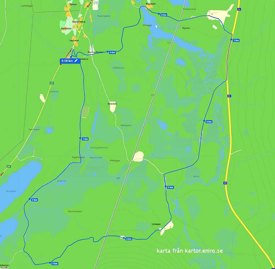 Vi fortsätter rakt fram över dammbron för timmerspelet och följer den blåmarkerade stigen som snirklar sig fram till grusvägen som vi startade vid.