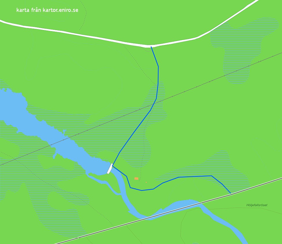 Själva Höljefallet ligger dock ytterligare en liten bit fram och en stig leder oss fram. Men, det är ganska mycket vegetation i vägen så det är svårt att få en bra vy över själva fallet. Röset syns en bit bort i ostlig riktning.