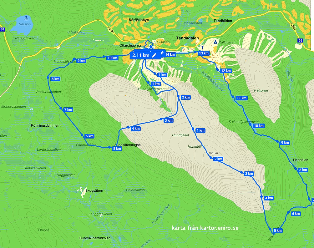 Västra Kalven och Kalven Runt. Efter några kilometers behaglig vandring är vi framme vid Tandådalens skidanläggning och nu viker vi av längs Hundfjällsbäcken bort till Hundfjället. Vi kan förstås även välja grusvägen bort mot Hundfjället.