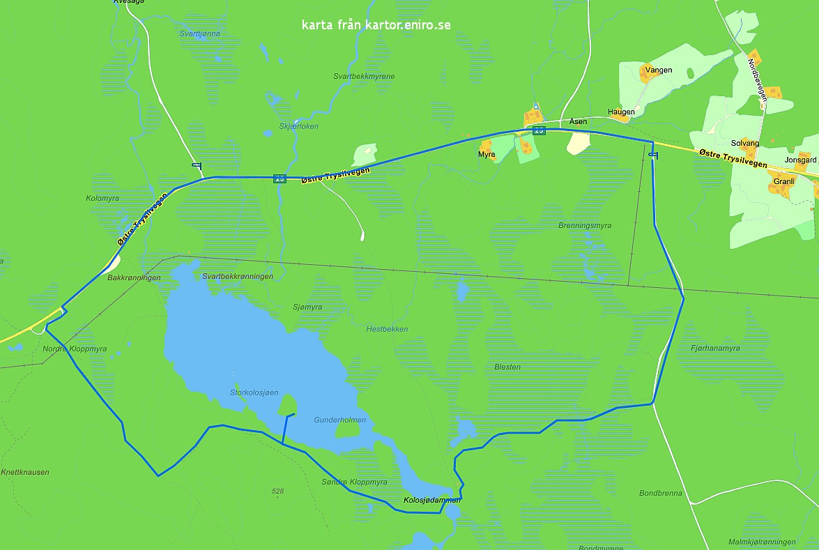 Vi går nu uppe på en dammvall en bit åt sydost innan Svenskvegen viker vänster mot Saetre nere vid Trysilelva. Vår stig fortsätter åt nordväst längs Bygdervegen och det är ömsom täta skogspartier och lite mer öppet med myr och små spännande tjärnar. Det finns mängder med svampar, lavar och annat intressant om man tar sig tid att titta. Stigen följer vi i cirka sexhundra meter ner till Kolosjöen och flotten vid Rundholmen.