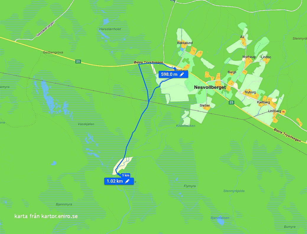Nu ska vi ta en kort men intressant tur inne på den norska sidan som jag hoppas att ni också provar på. Vi åker över gränsen mot Østby och i västra delen av Nesvollberget stannar vi vid